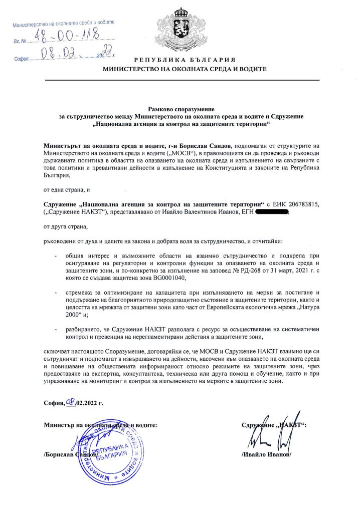 В Споразумението от 8 февруари 2022 г., подписано от Борислав Сандов и „Национална агенция за контрол на охрана територии“ - изрично е описано, че обект на охрана е точно и конкретно защитена зона по „Натура 2000“ – „Западна Стара планина“ с идентификационен номер BG0001040 и площ от 253 153 хектара. Зоната обхваща огромна територия, достигаща до българо-сръбската граница.